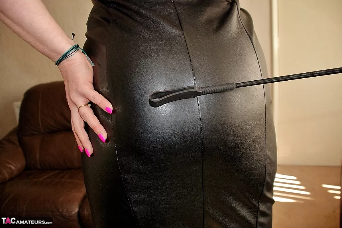 Рыжеволосая британка Джуси Джейни снимает кожаное платье в сексуальных чулках и сапогах