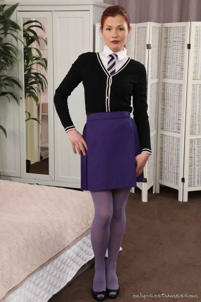 Рыжеволосая студентка Фрейя Эйч обнажает свои маленькие сиськи в фиолетовых чулках и подвязках