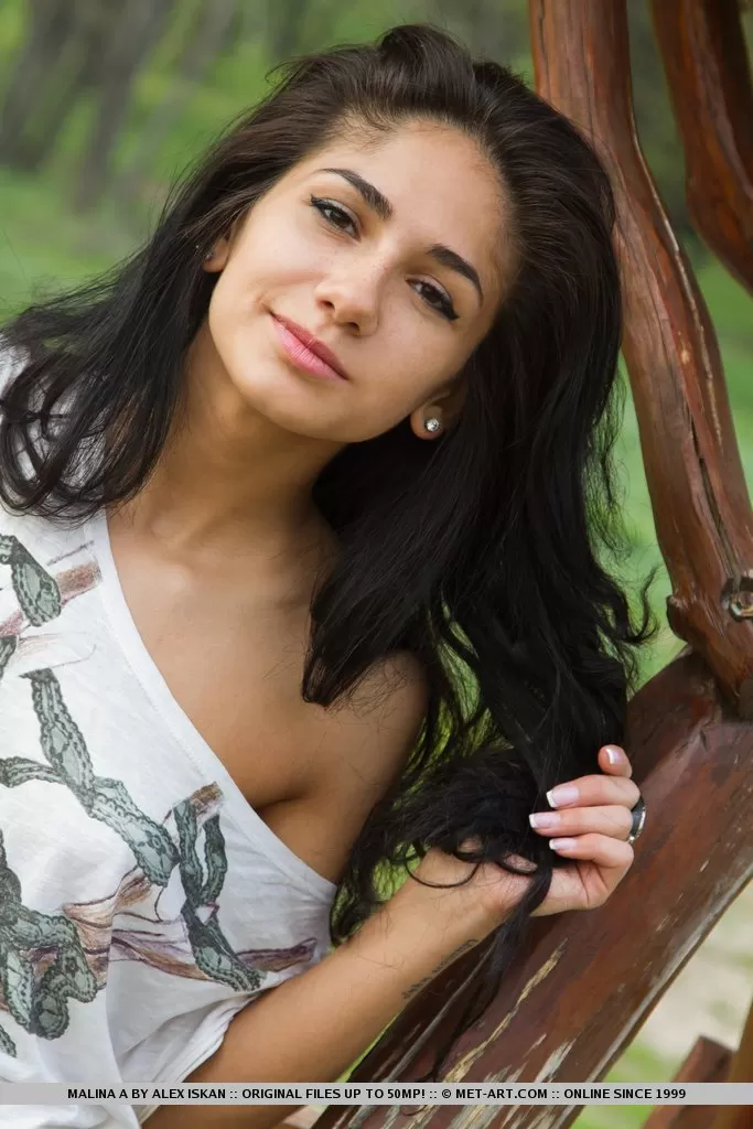 Русская молоденькая Малина А показывает свою тугую попку и киску на скамейке на открытом воздухе