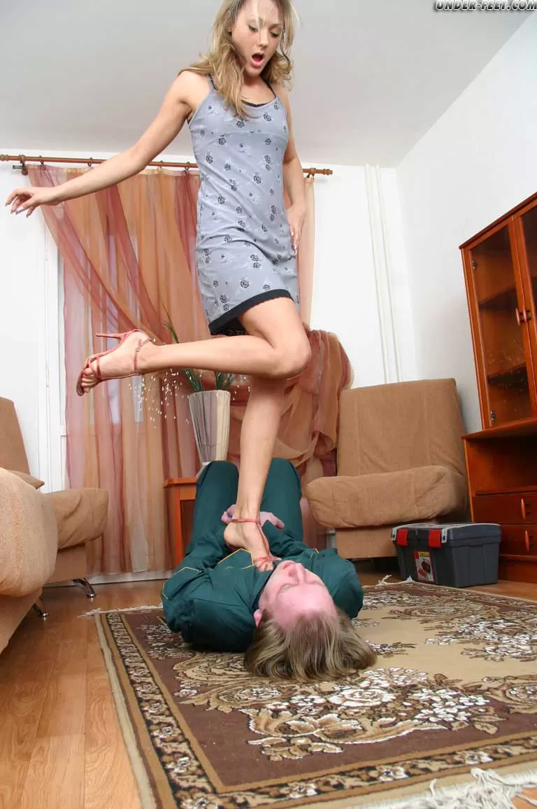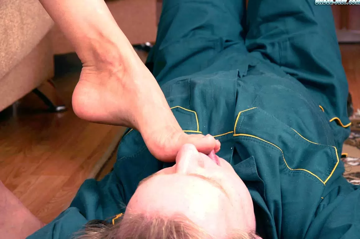 Симпатичная девушка курит, пока мужчина-сабмиссив поклоняется ее ногам