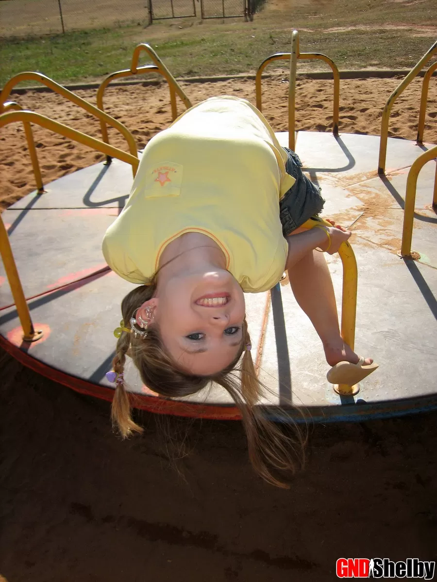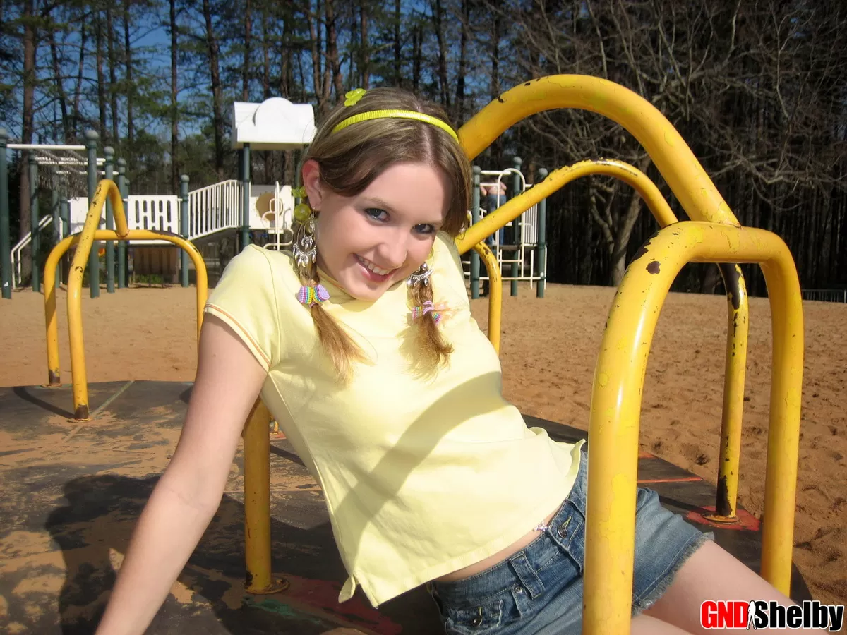 Симпатичная девушка обнажает свой лифчик и трусики под юбкой на детской площадке
