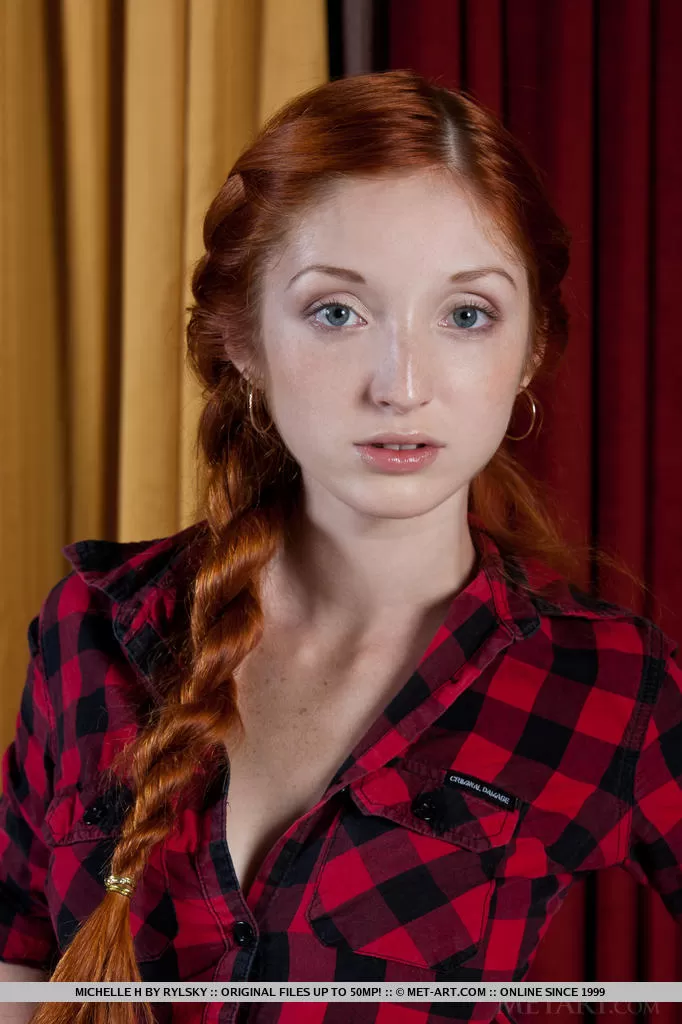 Симпатичная рыжеволосая девушка Мишель Эйч демонстрирует упругую грудь молодой девушки и лысую пизду
