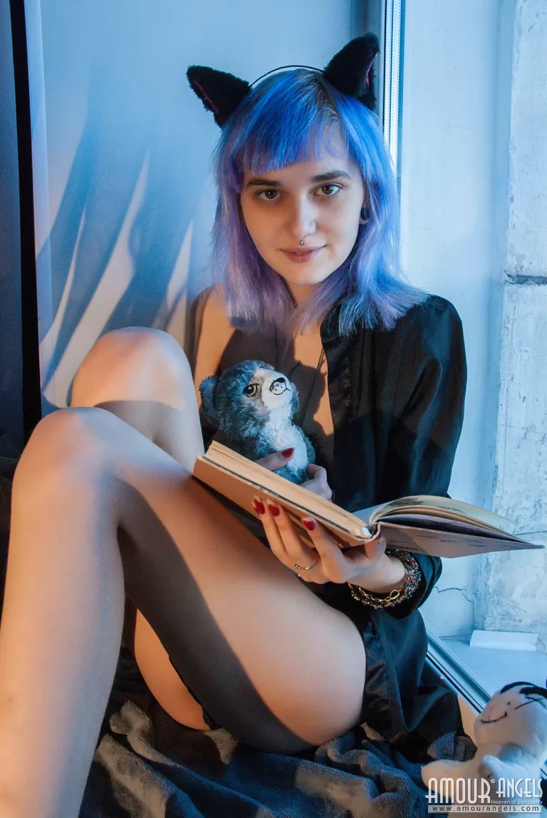 Синеволосая Китти Вилетт показывает свои упругие горячие соски и выставляет напоказ сексуальные босые ножки