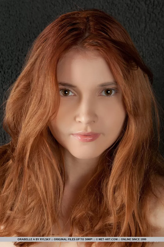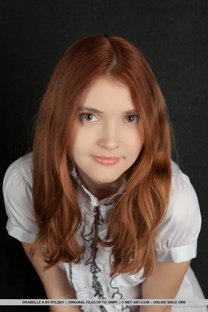 Сладкая рыжая милашка с симпатичной попкой Орабель растягивает свою волосатую пизду