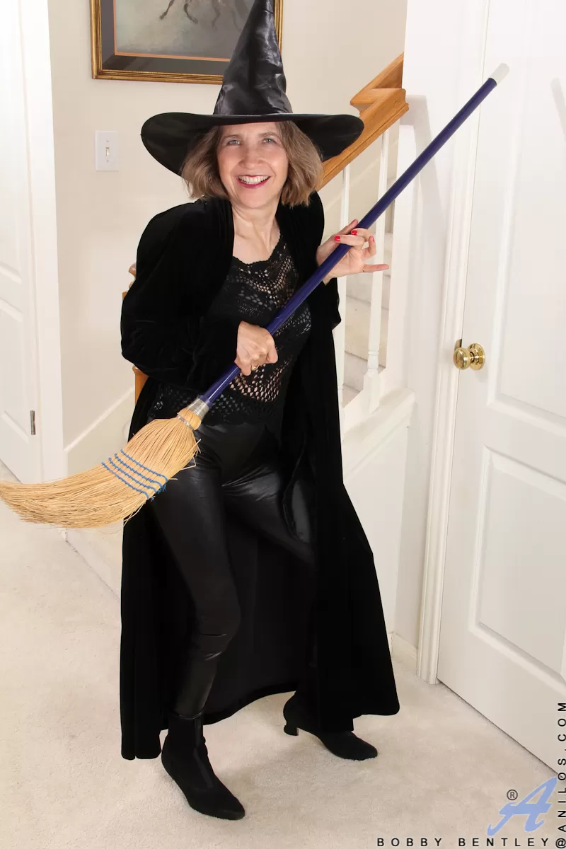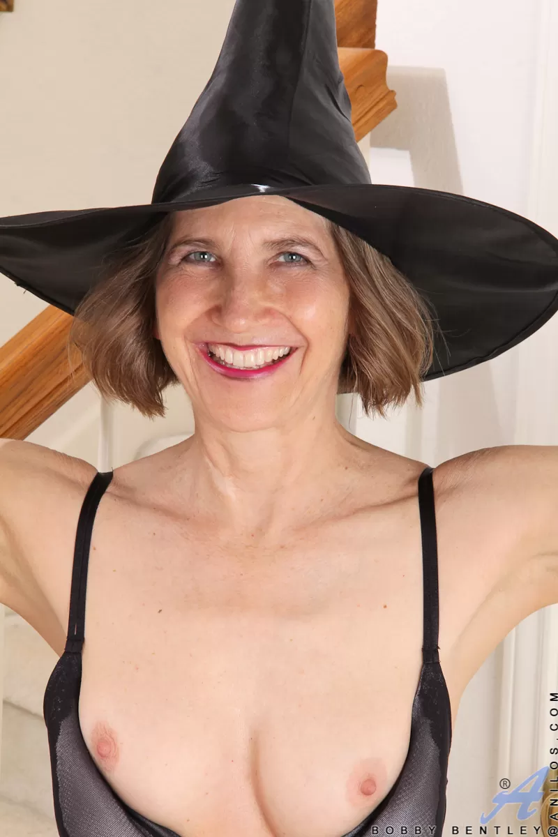 Старуха снимает свой ведьмин наряд, прежде чем раздвинуть свою пизду красными ногтями