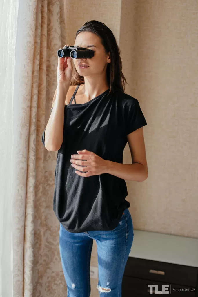 Стройная молоденькая Кристин мастурбирует, подглядывая за своими соседями в бинокль