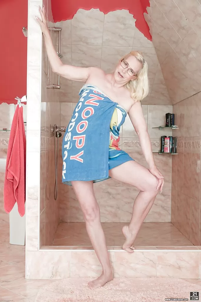 Светловолосая старая шлюха Виолетта залезает в душевую кабину и ополаскивает свою пизду