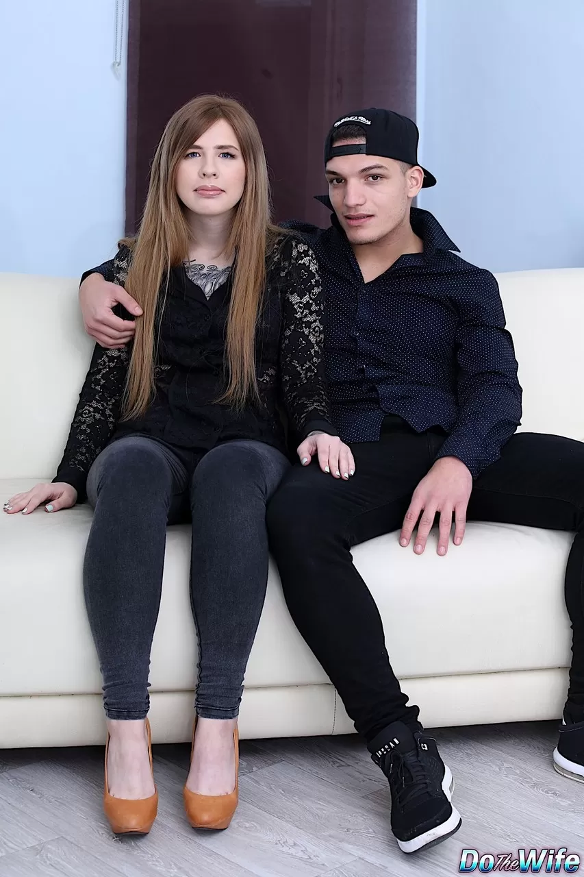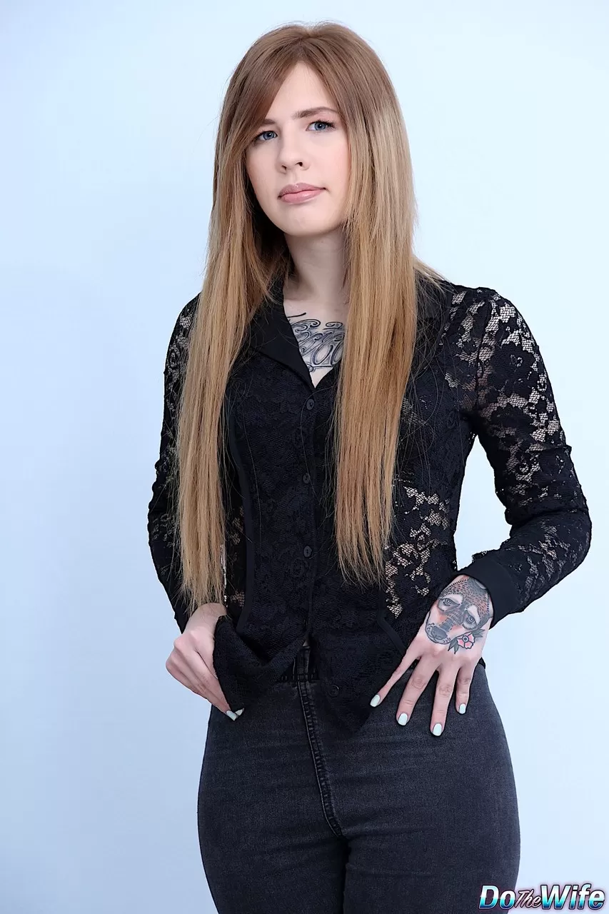 Татуированная женщина с длинными волосами трахается с другим мужчиной, пока муженек наблюдает