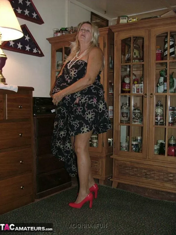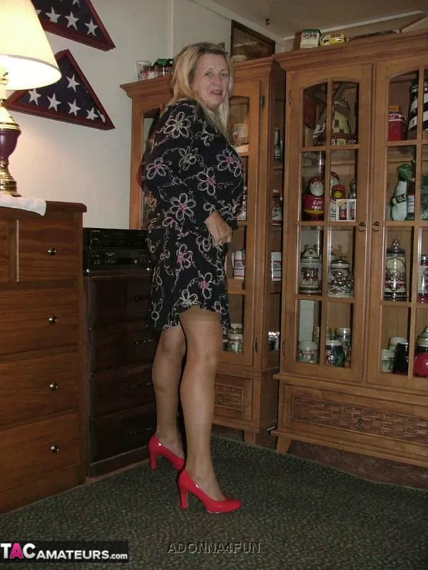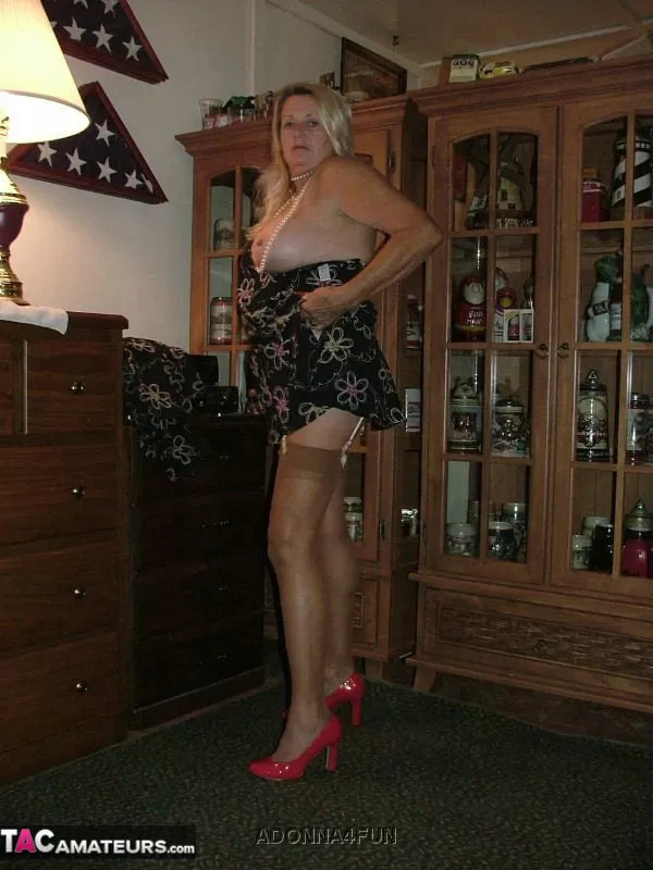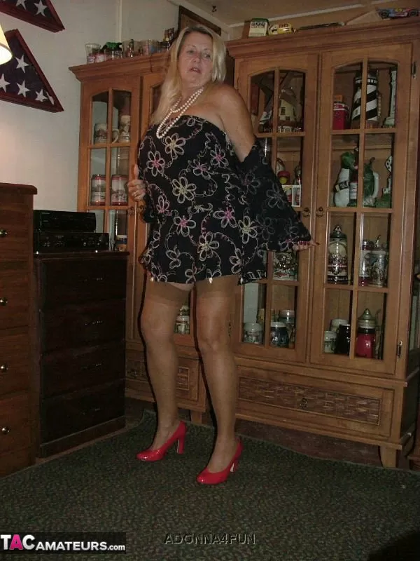 Толстая бабушка со светлыми волосами обнажает себя в коричневых нейлоновых чулках и подвязках