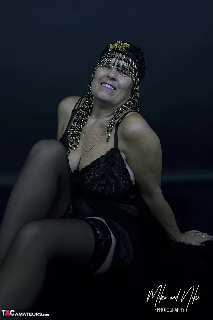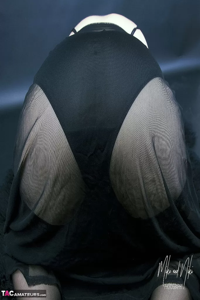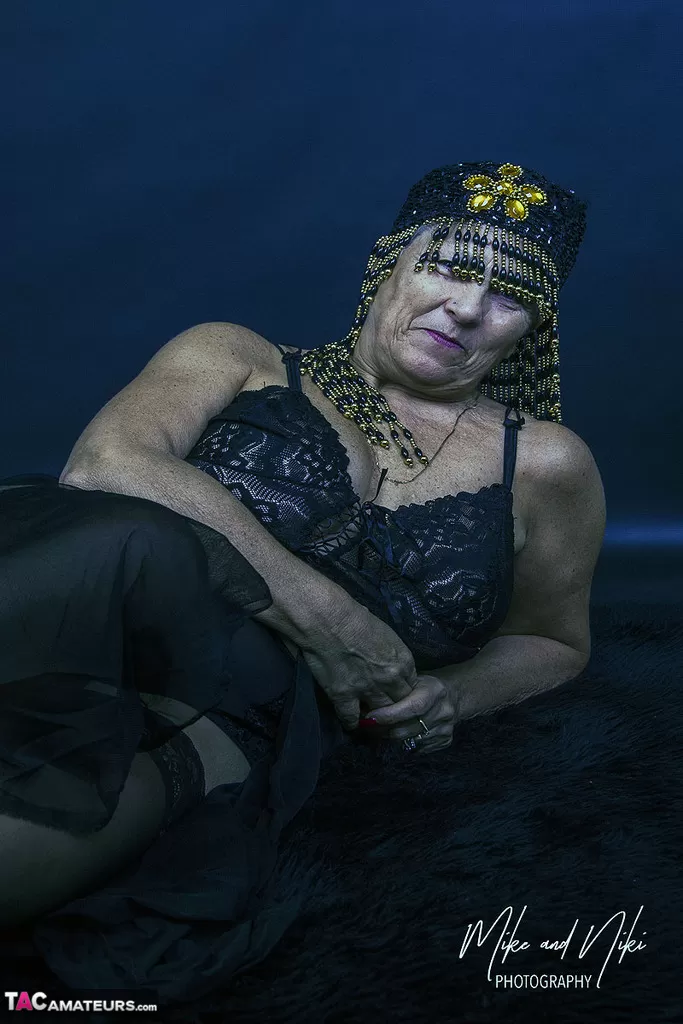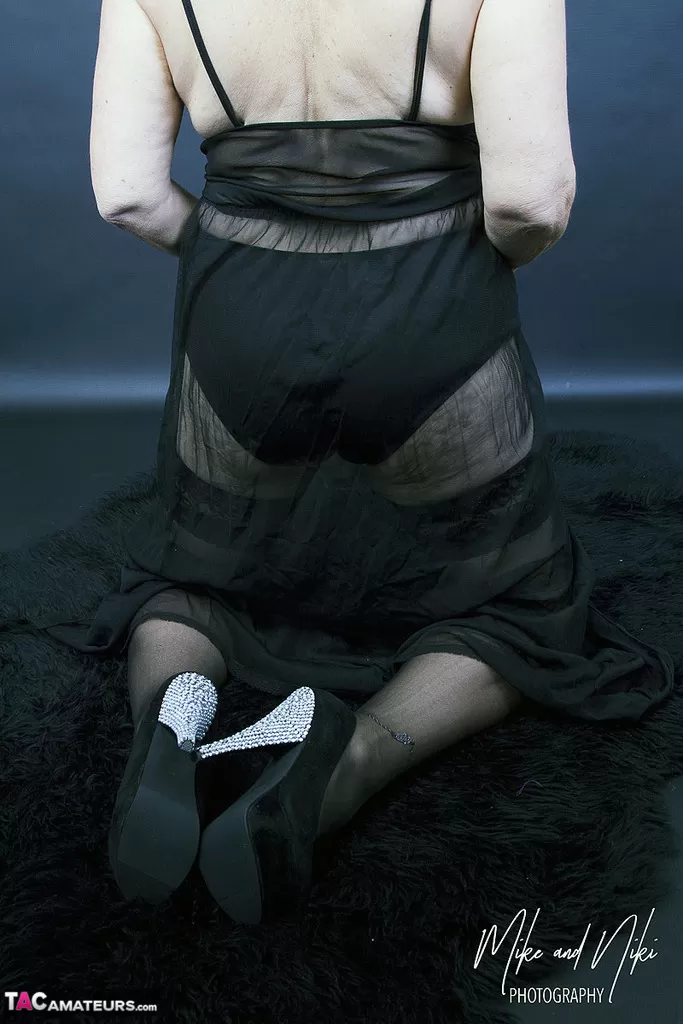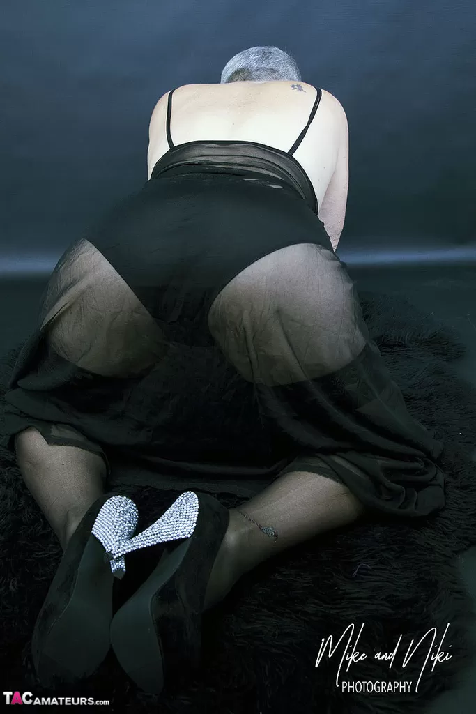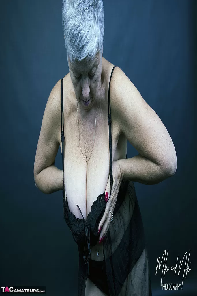 Толстая старуха Савана позирует не обнаженной в черном нижнем белье и прозрачных чулках