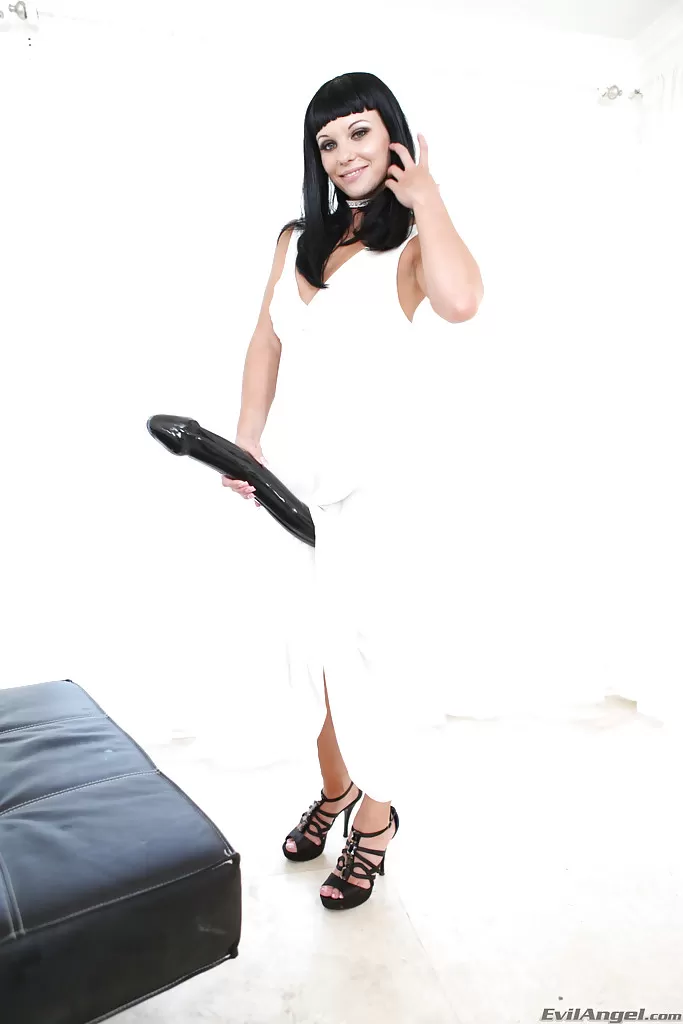 Ухаживающая красотка с волосами цвета воронова крыла развлекается в анал с огромным черным дилдо