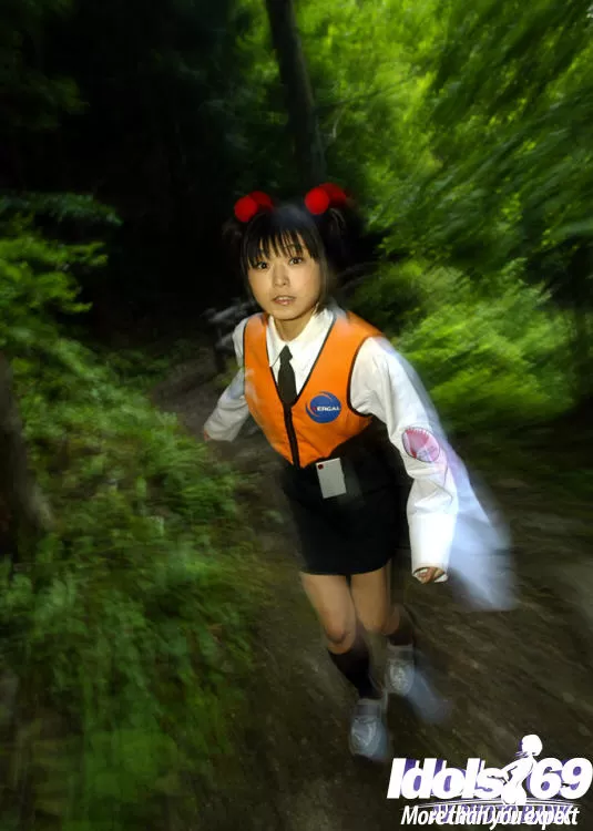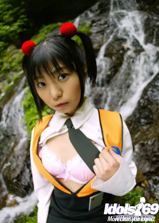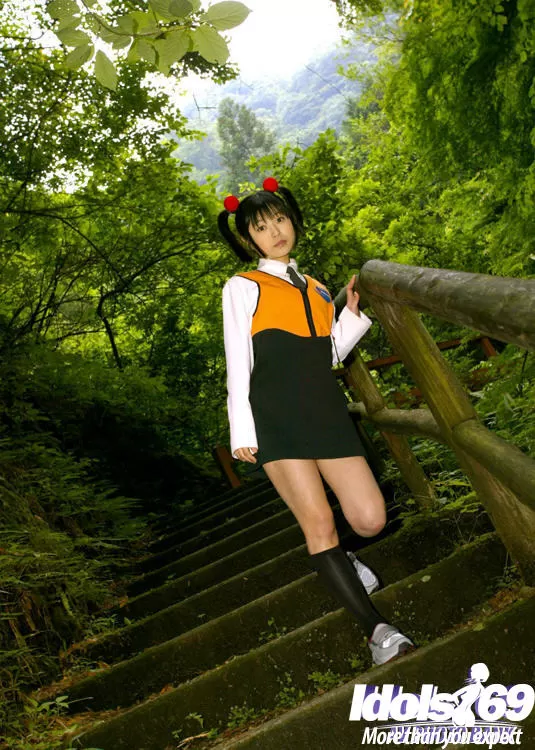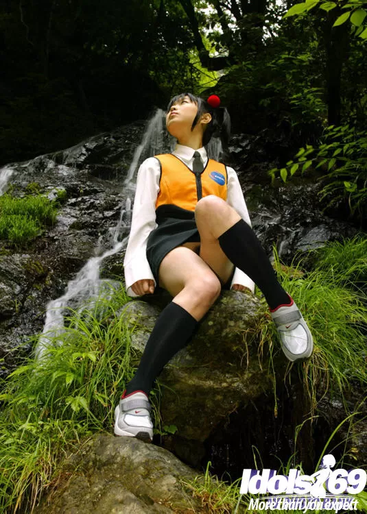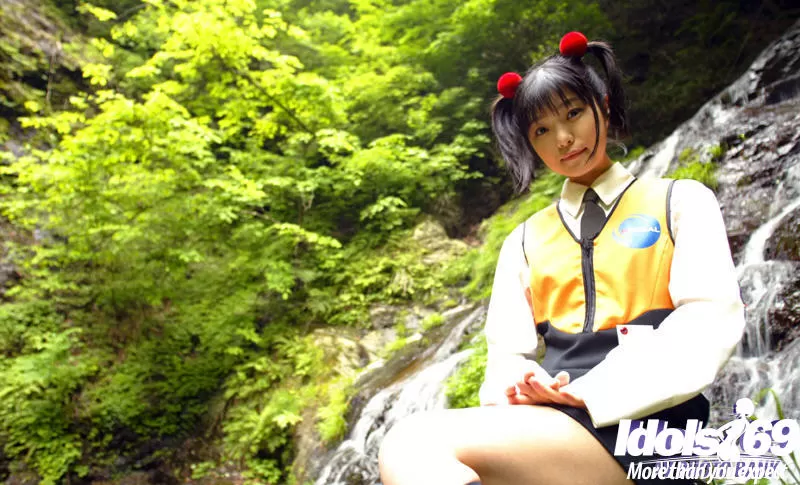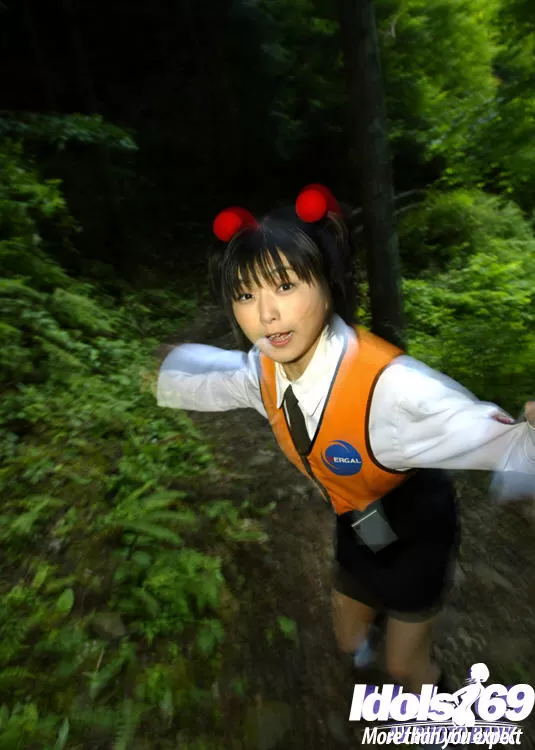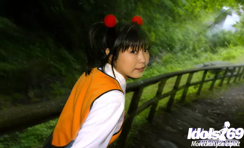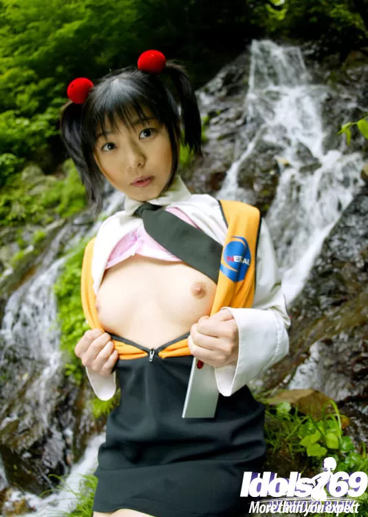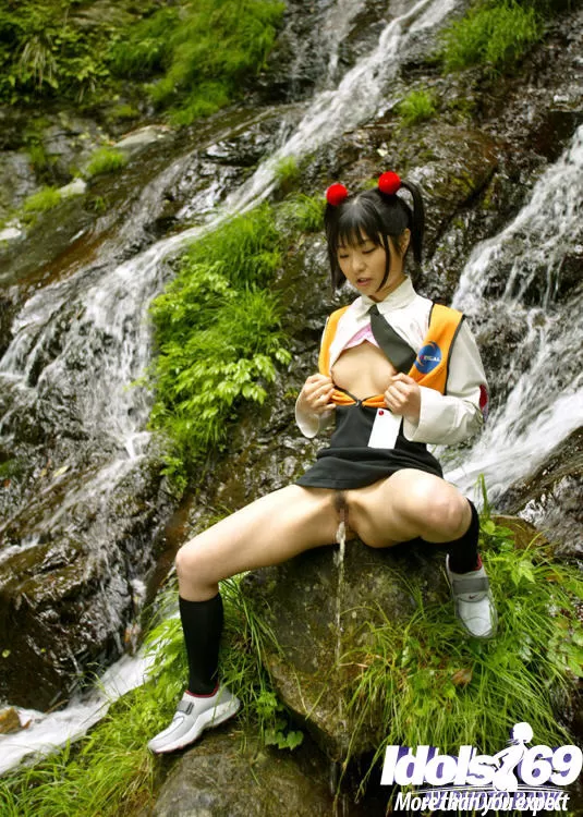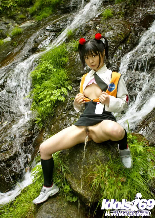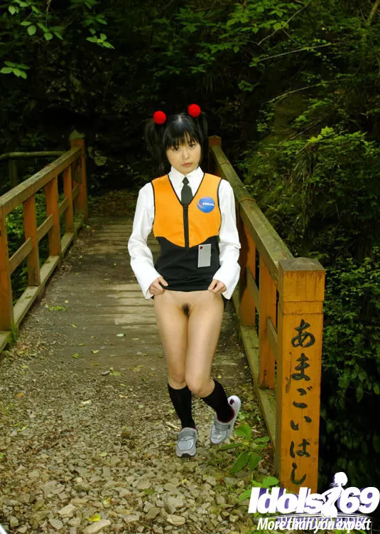 Улыбчивая студентка-азиатка показывает свои крошечные сиськи и пушистую пизду на открытом воздухе