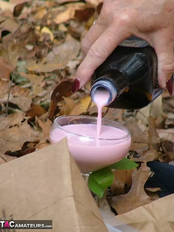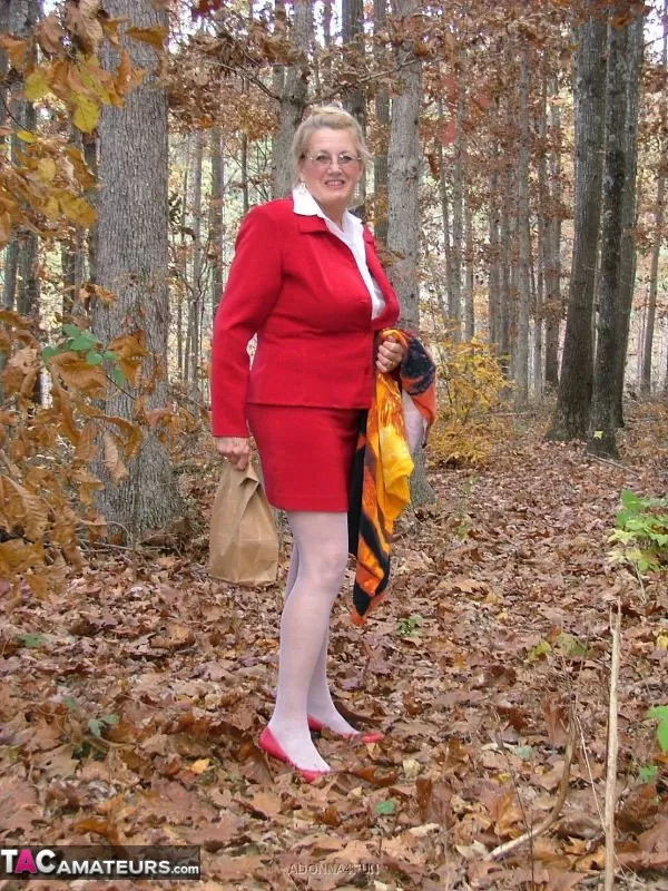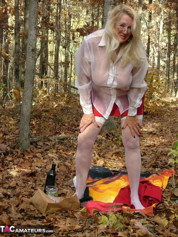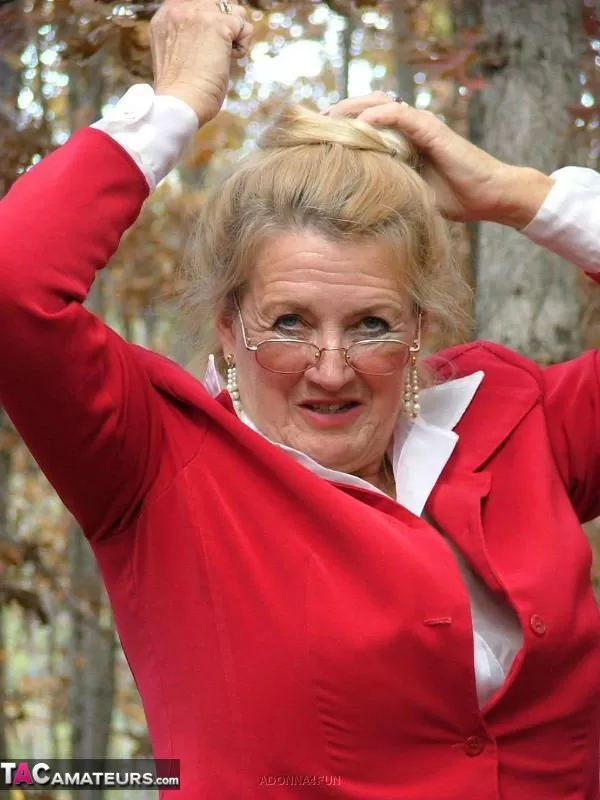 Возбужденная бабуля Адонна снимает трусики и забавляется с собой в лесу