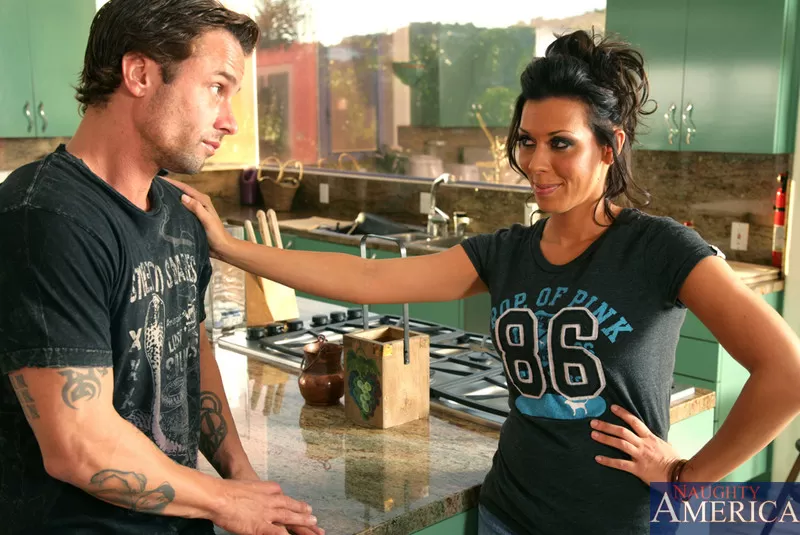 Возбужденная брюнетка Рэйчел Старр соблазняет женатого мужчину и трахается с ним на своей кухне