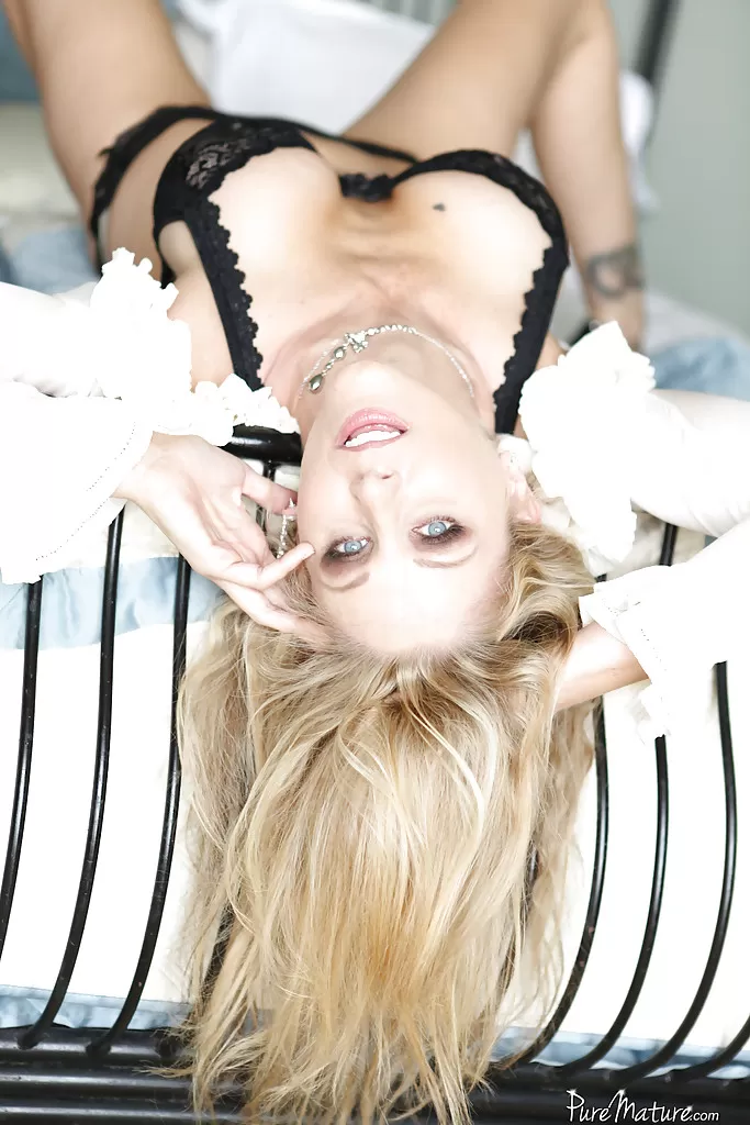 Зрелая красотка Джулия Энн лежит на кровати и мастурбирует свою киску