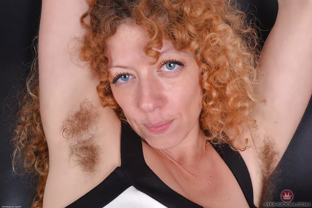 Зрелая рыжая с маленькими сиськами демонстрирует волосатые подмышки и вагину