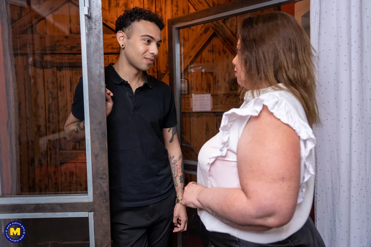 Зрелая толстушка Джени Уайт занимается сексом из жопы в рот со своим игрушечным мальчиком в чулках